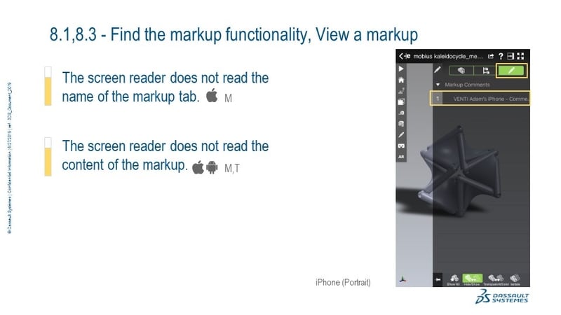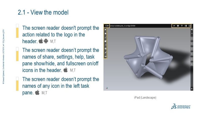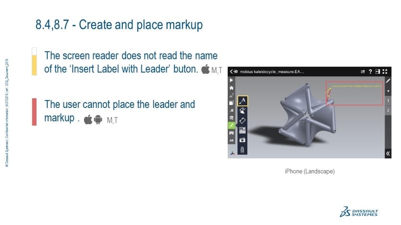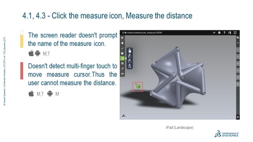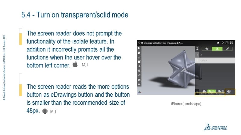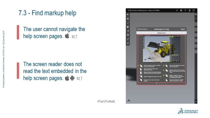 Identify the accessibility issues in the eDrawings Pro 2019 Android and iOS native applications across touch-based devices.